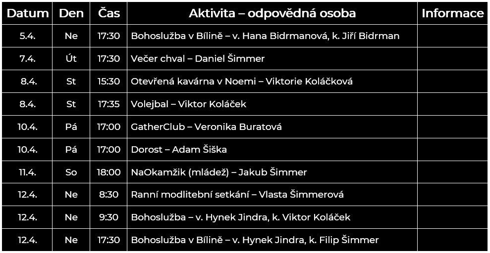 Každý týden tam najdete někoho od nás. Nebo můžete přijít s e svými přáteli a v klidu u nás posedět.